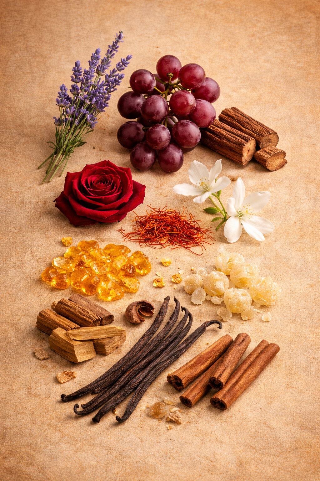 Un parfum né de l'hiver des Pouilles. Il évoque les cathédrales romanes de pierre claire. Lavande, bois de rose et raisins rouges s'ouvrent avec une fraîcheur douce et profonde. Au cœur, rose, safran et jasmin se mêlent en un accord chaud et lumineux. Le bois de cèdre confère à la structure une solidité noble, à l'image de la maçonnerie d'autrefois. Le bois de santal, l'ambre et le musc donnent au parfum son âme tranquille. Une touche de cannelle réchauffe comme la lumière du soleil d'hiver sur la pierre calcaire blanche.